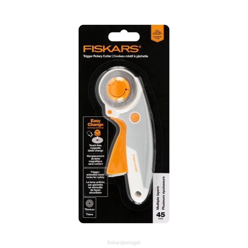 - cortador rotativo fiskars com gatilho de troca fácil, 45 mm possui uma lâmina magnética sistema de cubo para substituição da lâmina mais segura, fácil e rápida