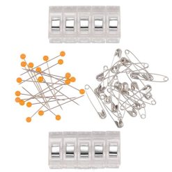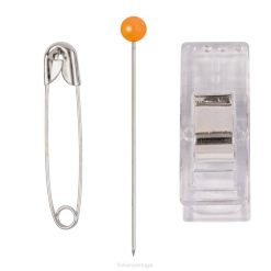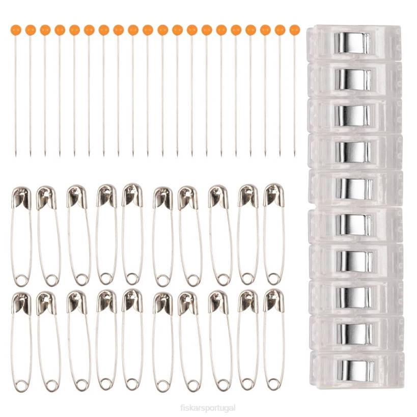 fiskars kit de fixação inclui itens essenciais de fixação para todos os costureiros. O kit inclui 20 alfinetes retos com cabeças laranja fáceis de localizar, 20 alfinetes de segurança grandes com revestimento de níquel resistente à ferrugem e 10 clipes de costura versáteis que mantêm as camadas de tecido planas para facilitar a alimentação do calcador da sua máquina de costura.